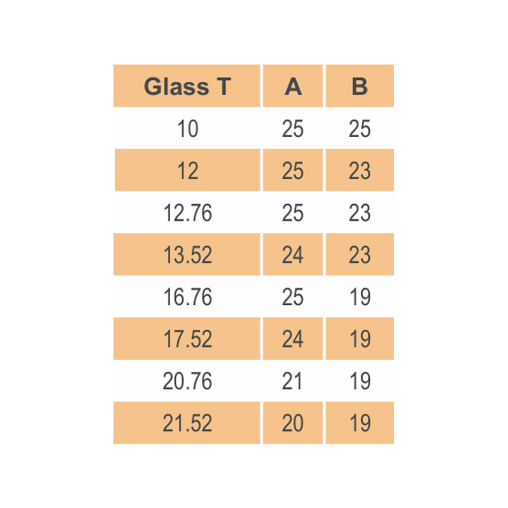 • Glass thicknesses (mm): 10; 12; 12,76; 13,52; 16,76; 17,52; 20,76; 21,52